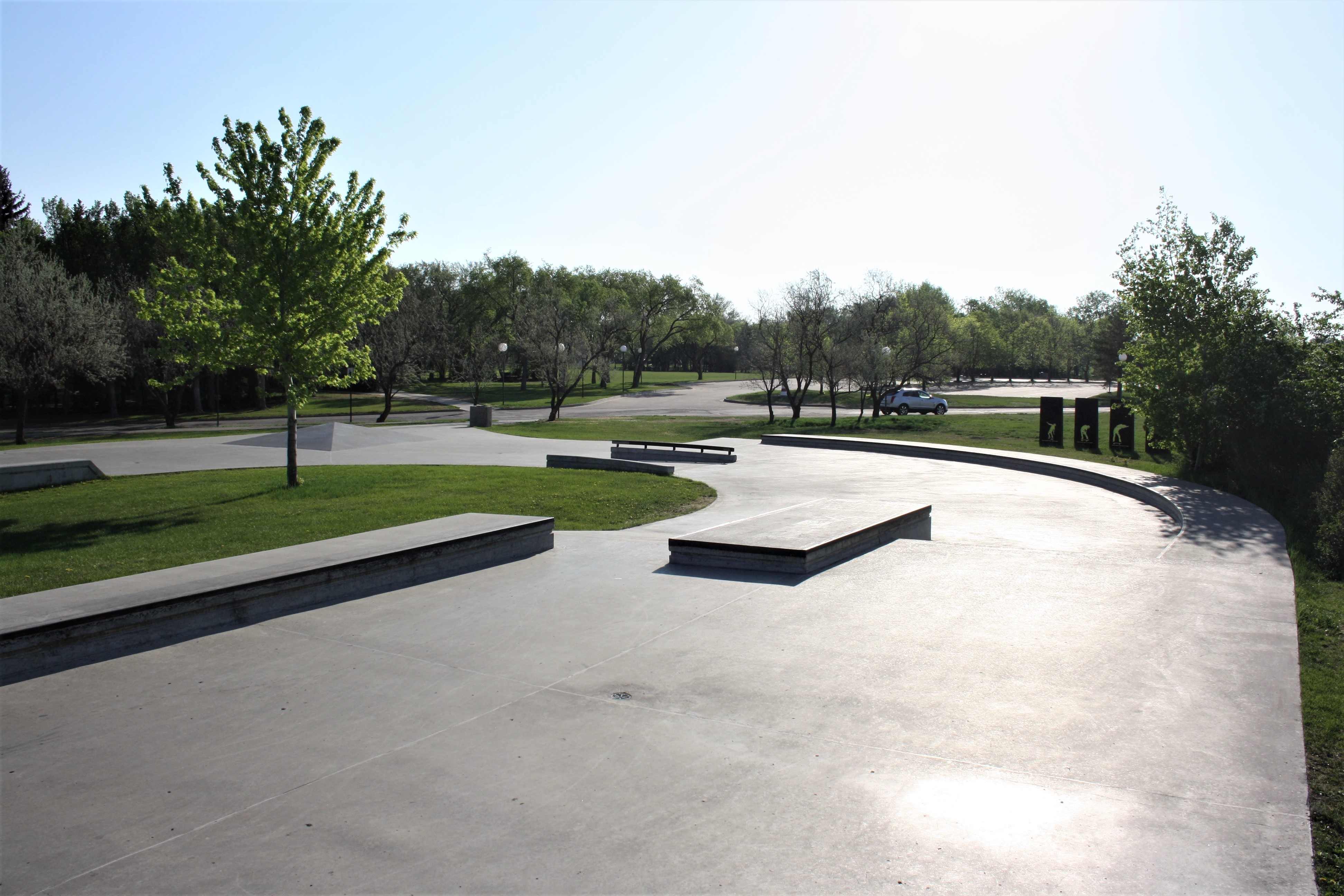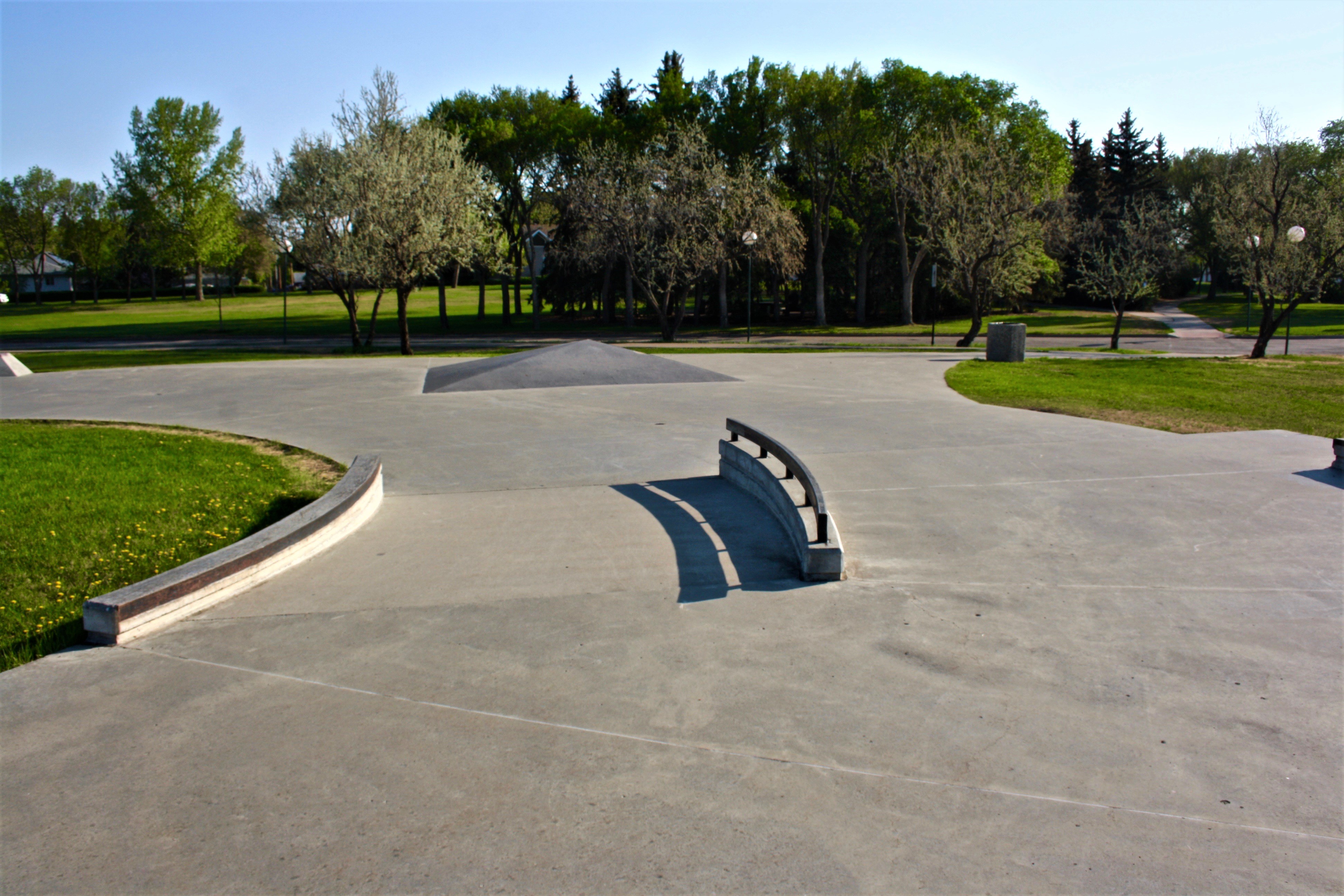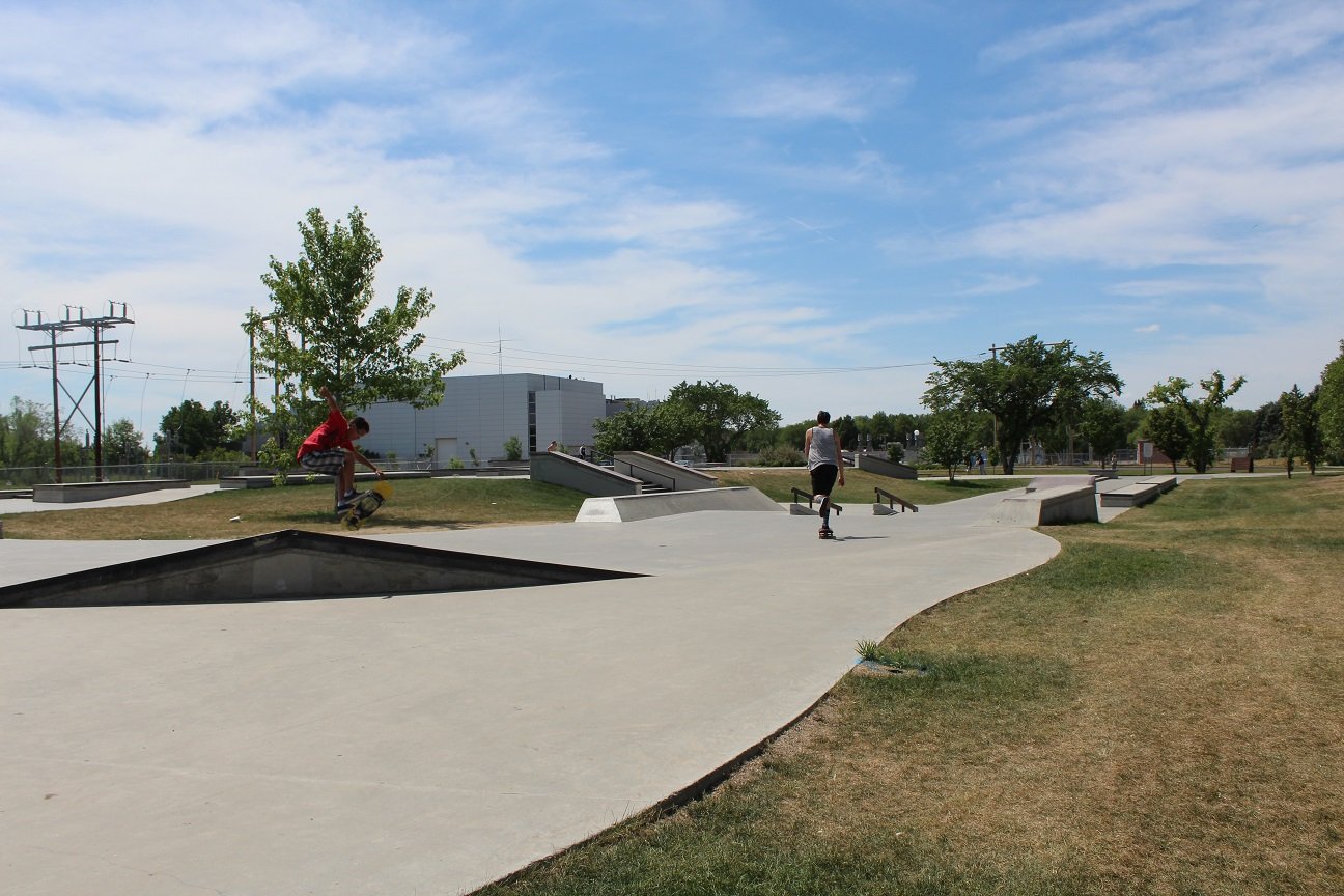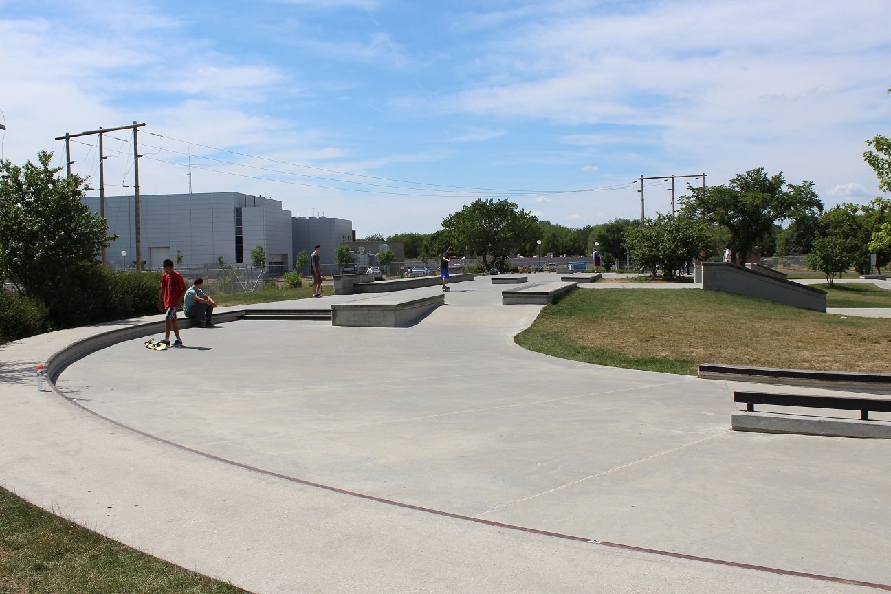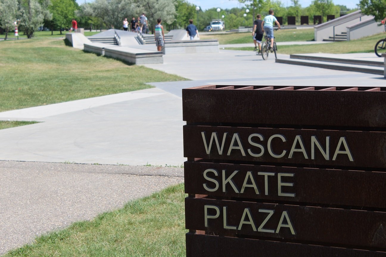 The difference between a skateboard park and a skate plaza is that the former typically has ramps, bowls, half-pipes and pyramids. A skate plaza is designed for “street skating” by incorporating urban terrain elements such as benches, rails and ledges. Through the use of landscaping and art, a skate plaza may resemble a town public square which allowed it to become a multi-use park which is aesthetically pleasing. The Skate plaza is located across from Candy Cane Park, near the Saskatchewan Science Centre.
