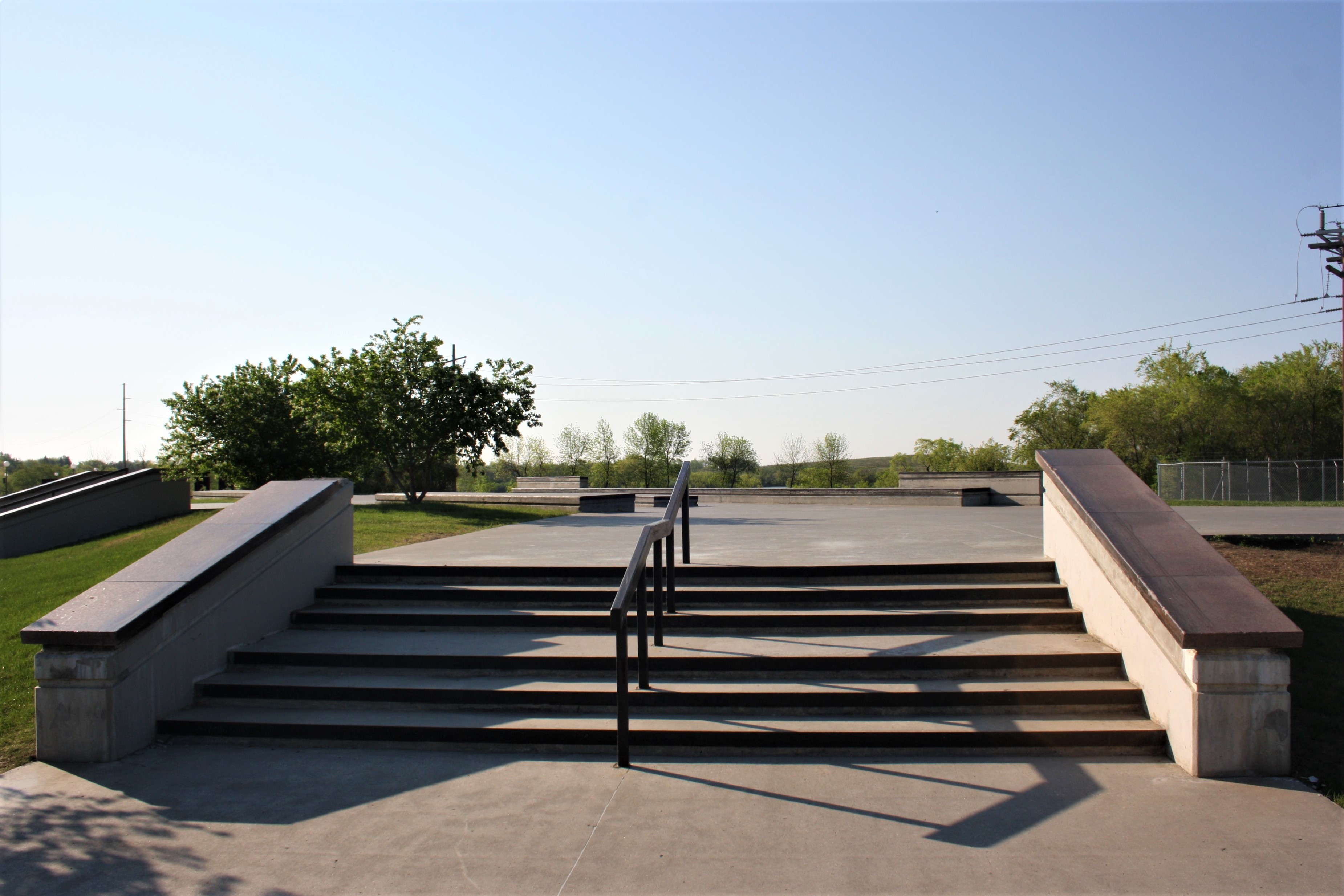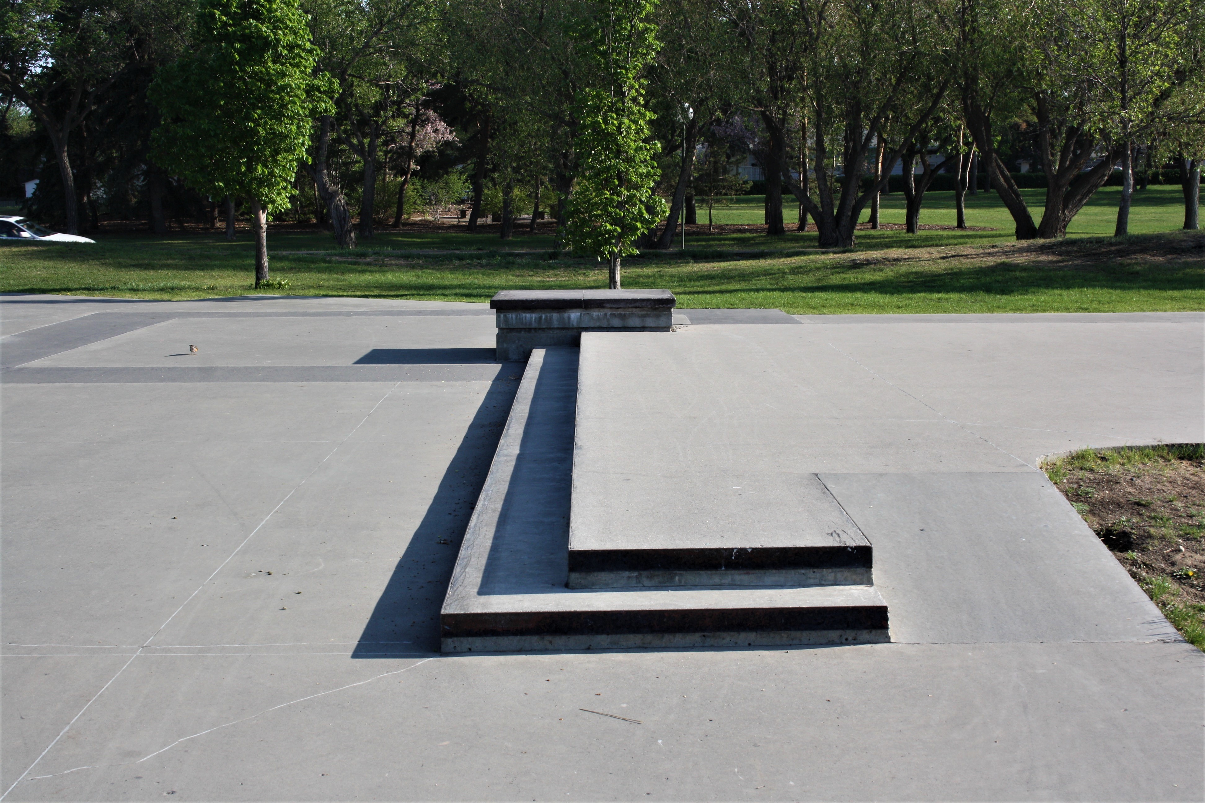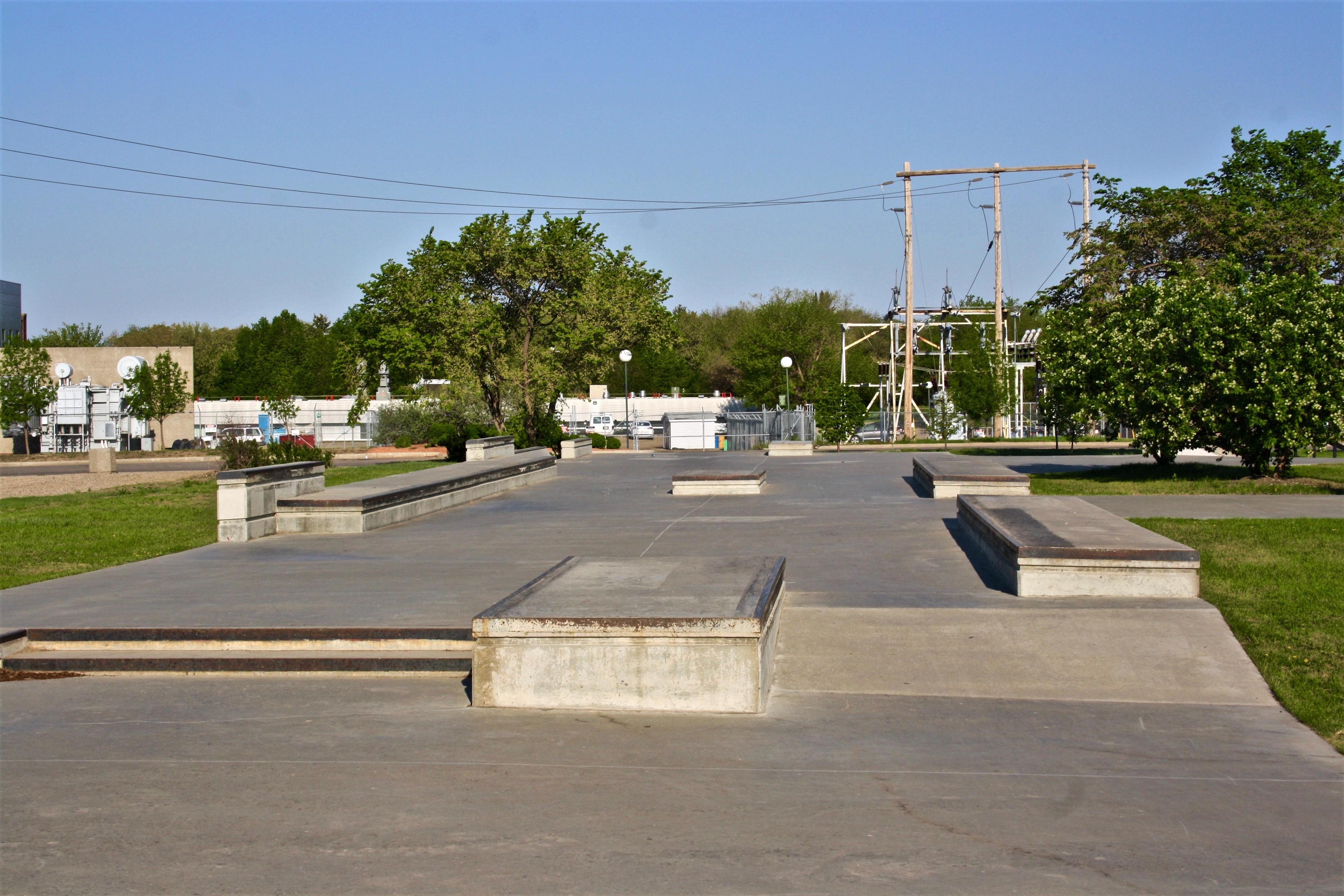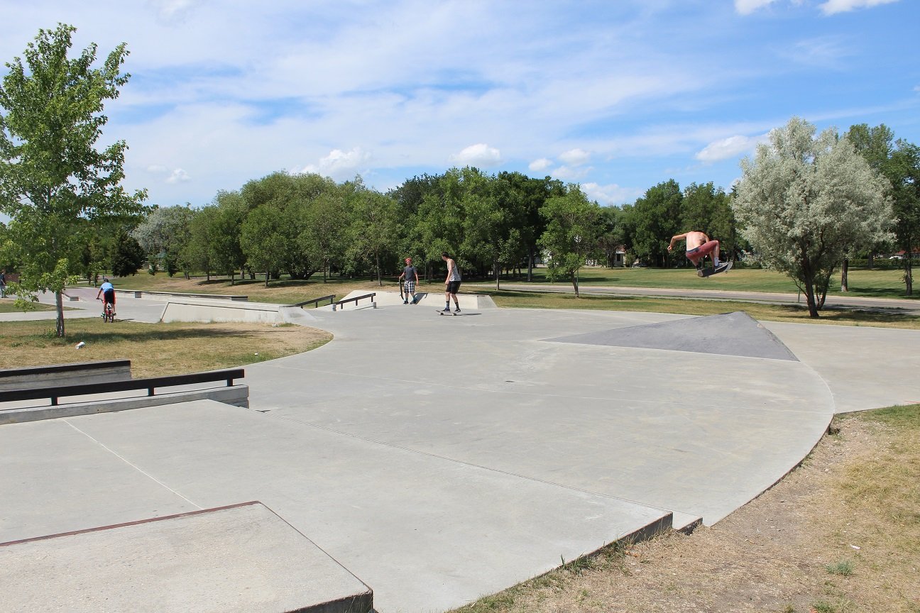 The difference between a skateboard park and a skate plaza is that the former typically has ramps, bowls, half-pipes and pyramids. A skate plaza is designed for “street skating” by incorporating urban terrain elements such as benches, rails and ledges. Through the use of landscaping and art, a skate plaza may resemble a town public square which allowed it to become a multi-use park which is aesthetically pleasing. The Skate plaza is located across from Candy Cane Park, near the Saskatchewan Science Centre.